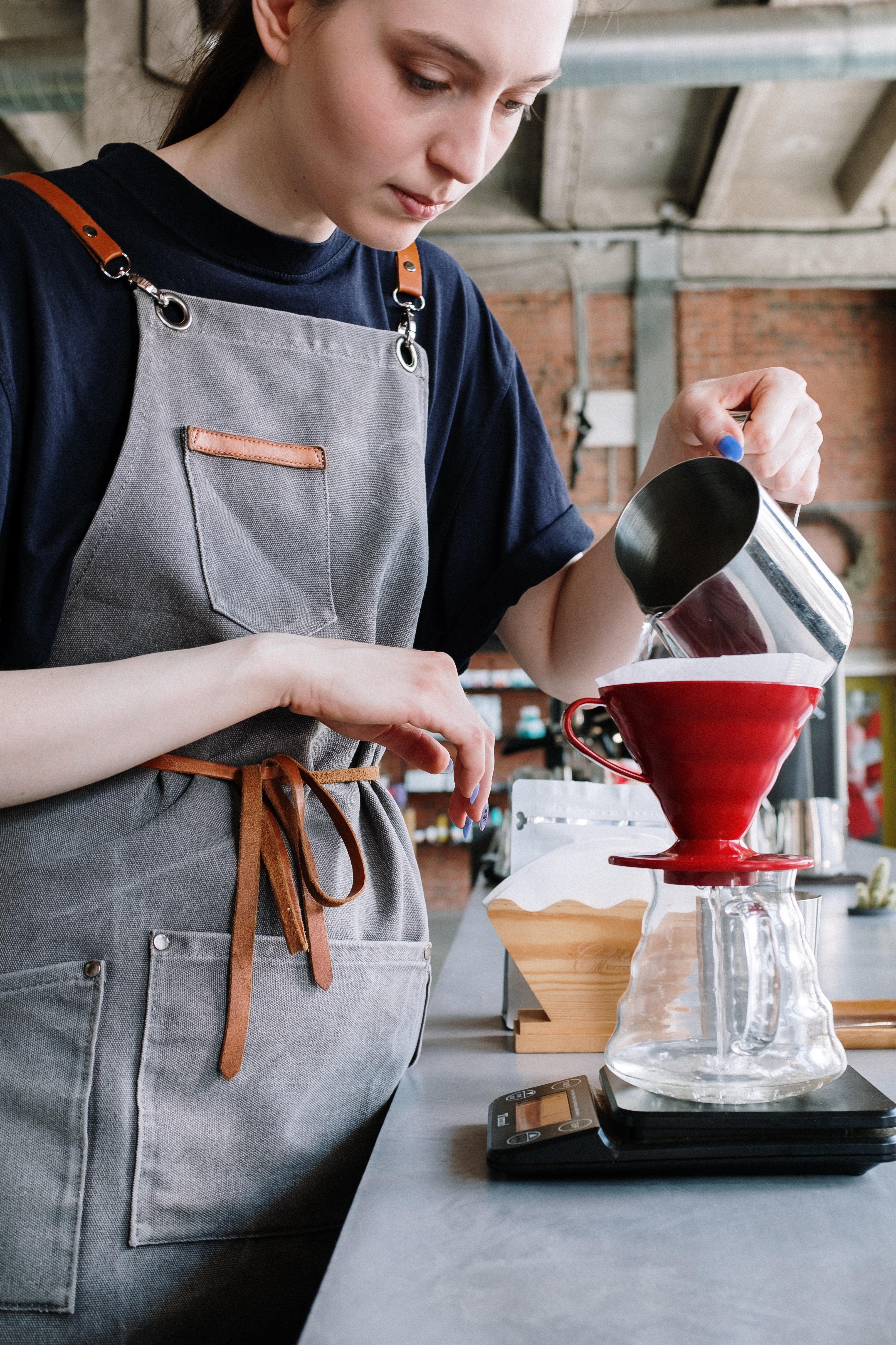 물을 부을 때에는 안쪽에서 바깥쪽으로 나선형으로 부으며 물이 커피 가루를 통과해 추출되는 과정이 끊이지 않도록 시간을 잘 맞추어 여과기 안에 물이 없어지지 않고 거품이 꺼지기 전에 조금씩 물을 부어야 한다. 드립식 추출방식에서는 뜨거운 물을 사용하는데 차를 우릴 때 물 온도가 차 맛을 좌우하듯이 커피의 추출에 있어서도 물 온도가 매우 중요하다. 온도가 끊는 점보다 높으면 약간 하얀 거품이 생기고 카페인이 쓴맛으로 변한다. 반면 온도가 낮으면(80도 이하) 탄닌이 산화해 버리므로 주의해야 한다.