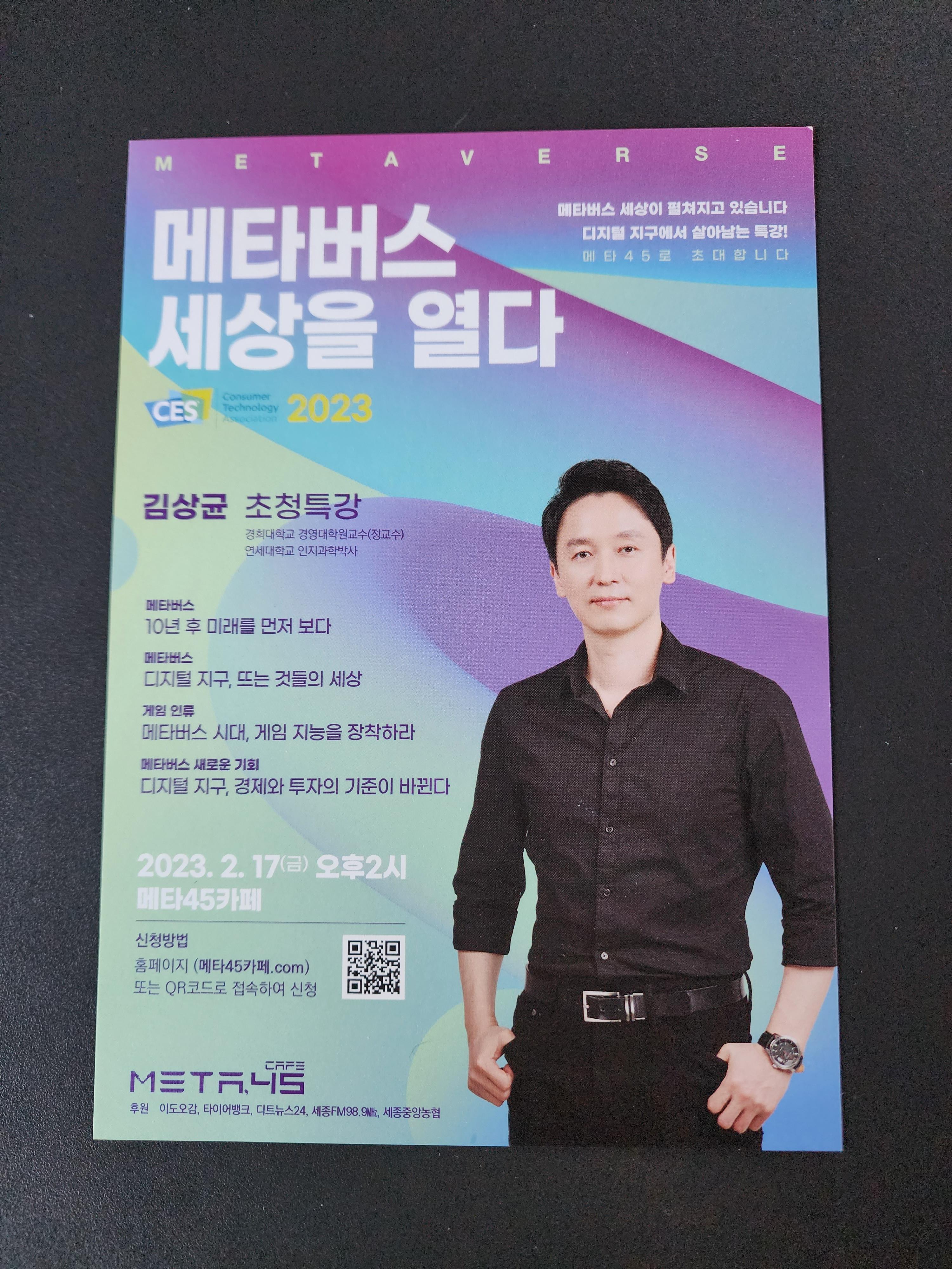 요즘에 메타버스라는 말을 많이 들어보셨을 거예요. 23년 2월 17일 "메타 45"카페에서 김상균 교수님을 초정하여 메타버스에 관한 강의가 있다고 합니다. 관심 있으신 분들은 홈페이지(메타 45 카페. com)에 접속하여 신청하시면 되세요. 세종에서 가장 높다는 카페를 직접 방문해 보니 새롭고 좋았어요. 가족, 연인, 지인들과 세종 도심의 뷰를 감상하고 싶으신 분들에게 추천해 드립니다. 오늘도 유익한 정보 되셨다면 구독과 좋아요 눌러주시면 감사하겠습니다! :)